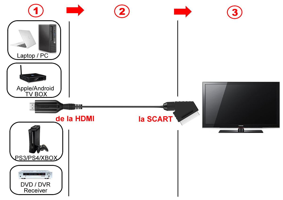 - de la dispozitive cu mufă HDMI (calculator, laptop, consolă, receiver, decodor video, dvd player, tv box, chromecast, alte aparate hdmi), spre televizor cu mufă SCART, NU ŞI INVERS.