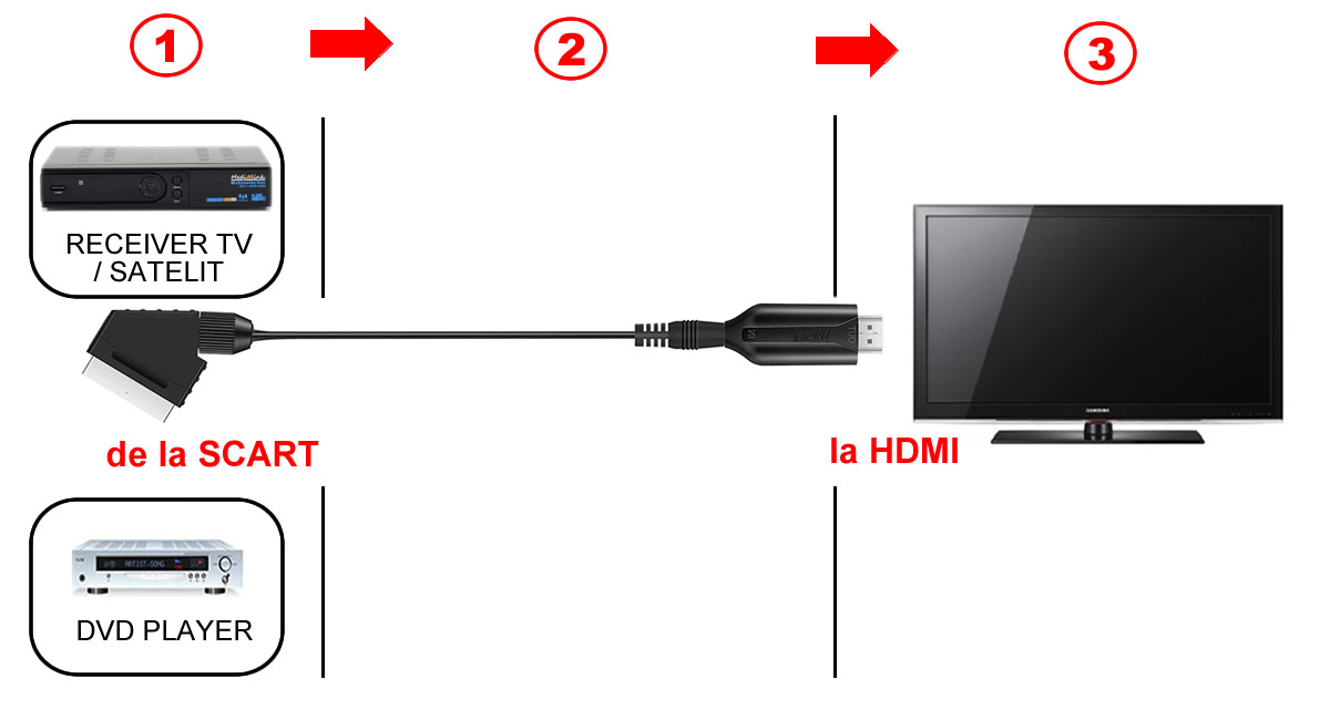 - de la dispozitive cu mufă SCART (receiver, decodor video, dvd, alte aparate cu scart)spre televizor cu mufă HDMI (sau monitor, videoproiector), NU ÅžI INVERS.