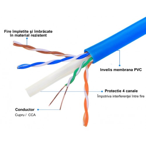- Cablu de retea UTP cat.6e, full cupru 0.4mm, nemufat, la rola de 275M, albastru.